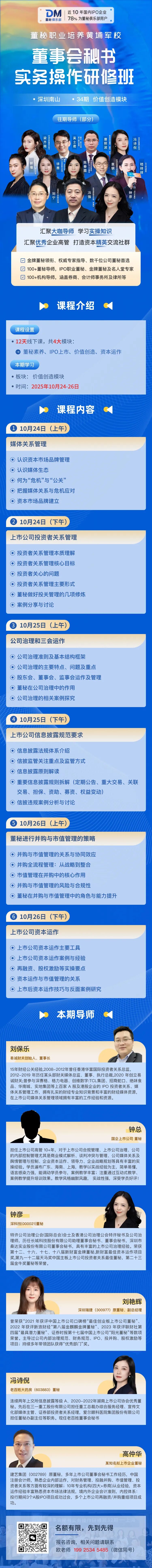 我们的线下课程《董秘实务操作研修班》由资深董秘和行业专家授课,内容涵盖IPO上市、投资者关系管理、资本运作等核心技能,通过案例分析、模拟路演等实战训练,帮助学员快速掌握董秘工作要点。近期《董秘实务操作研修班》将于10月24-26日深圳开课,欢迎联系欧老师【19925345485】咨询了解!