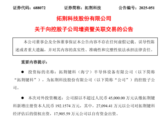 近日,拓荆键科官宣获得10.395亿元战略融资擒牛宝配资,由拓荆科技、展昀启、展昀禾、同鑫力诚、国投创业、国方创新等联合投资,其中拓荆科技出资4.5亿元,并发布了关联交易公告。